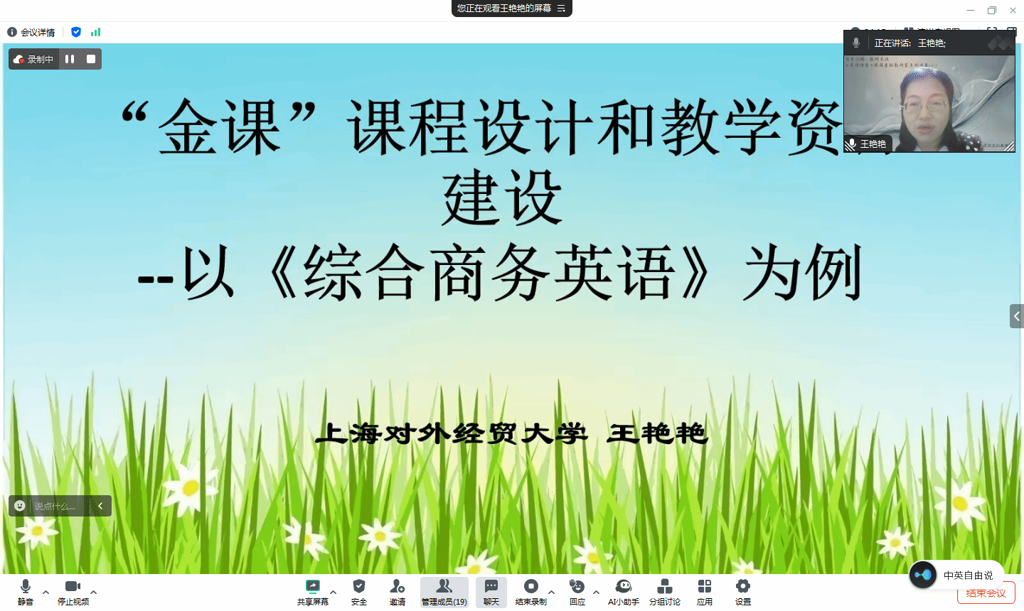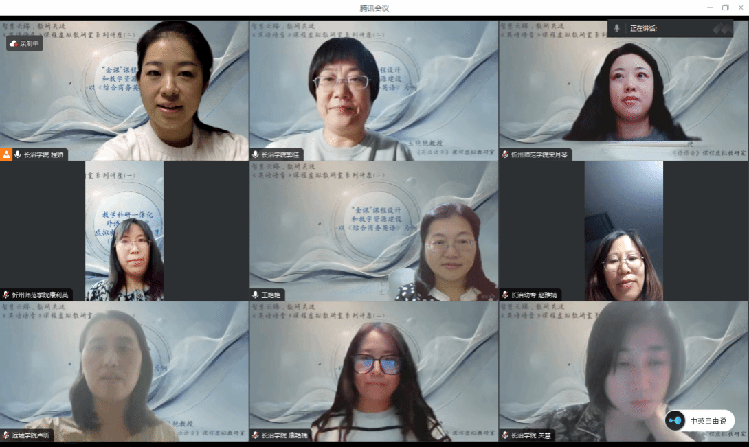 2024年9月26日,由国家级一流课程《英语语音》团队倾力打造的《英语语音》课程虚拟教研室第二场“智慧云端,教研共进”系列讲座开讲。会议邀请了上海对外经贸大学教授王艳艳老师以“金课”课程设计和教学资源建设为题,在共研共进的云端进行了精彩的经验分享,必威西汉姆联系主任、《英语语音》课程虚拟教研室负责人郭佳老师主持,全体虚拟教研室团队成员及必威西汉姆联商务英语教研室教师参加并积极讨论。