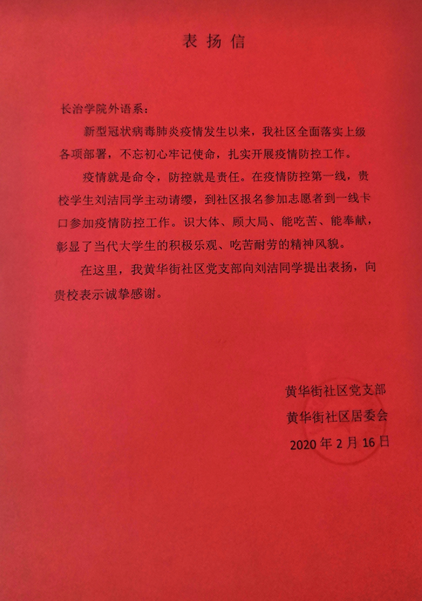 近日,我系陆续收到社会各界的感谢信,社会各界热情赞扬了我系青年志愿者在疫情防控期间敢于奉献、吃苦耐劳的精神,充分体现了我系广大青年学子的的社会担当,极大鼓舞了青年志愿者的斗志和勇气,坚定了克服困难、战胜疫情的信心和决心。在此,我系也向所有地方基层表示感谢,能够提供机会让我系广大团员青年参与到疫情防控工作当中,让他们拥有别样的收获和经历。