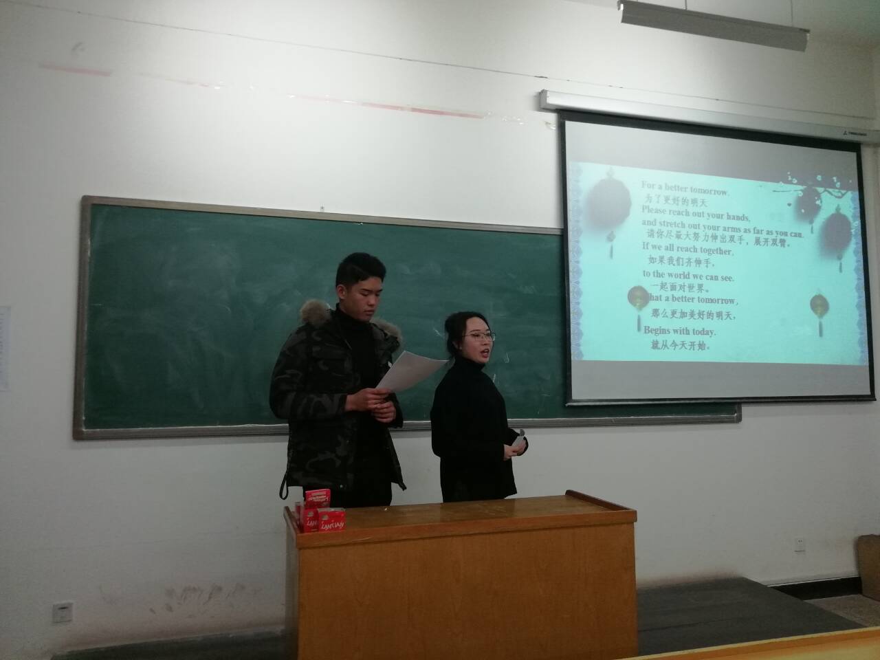 主持人冯敏、荆奕辰与在场同学一起朗诵的英文小诗为本次活动拉开了序幕。随即,主持人抛出了两个问题, “今天你奋斗了吗?”和“对于即将到来的2019年有什么打算?”,同学们积极发言,谈起了2018年留下的遗憾与收获,也对即将到来的2019年做出了规划与期许。