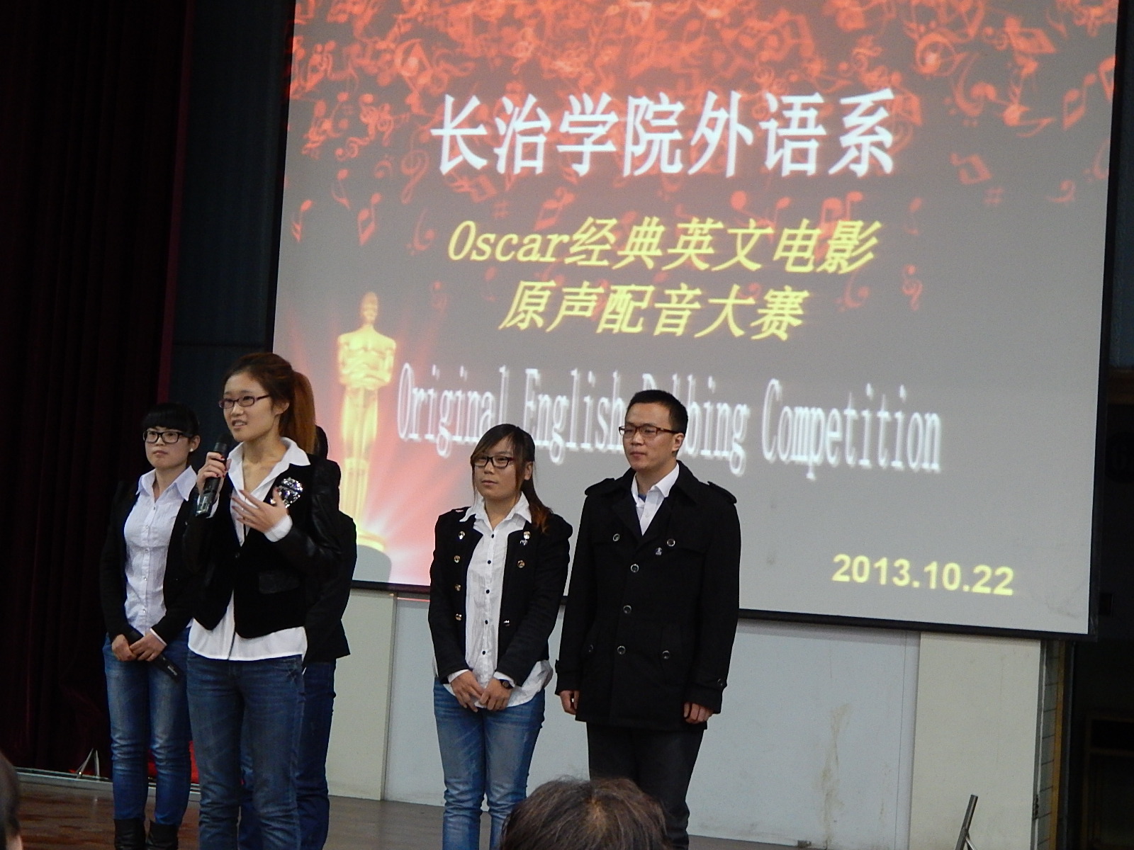 为进一步丰富我系学生第二课堂,激发其英语学习的热情,提高大家的英语语言素养,我系于10月22日19:00在综合楼六楼报告厅成功举办了“Oscar经典英文电影原声配音大赛”。系党总支书记晋红、系主任郭佳、副主任卫永清和晋胜利、外教Brian等老师出席并担任本次大赛的评委。