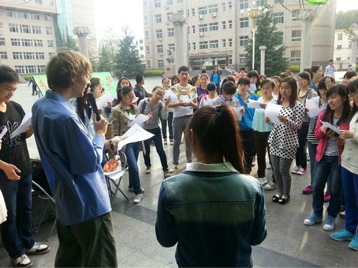 外教Julian应邀参加本次活动。在Julian的带领下,大家大声地朗读英文。主持人有序组织了“you know, I know, we know”和“Musical chairs”两个游戏。各系同学都踊跃参与其中,气氛十分活跃。最后,活动在Julian悠扬的歌声中走向尾声。活动结束后,同学们意犹未尽,纷纷表示今后要继续参加英语角活动。