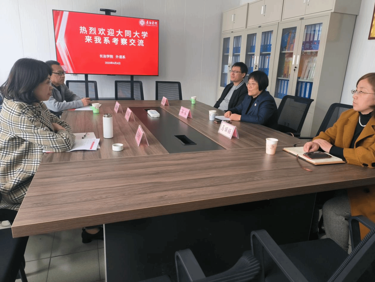 4月4日上午,大同大学外语学院院长张晓世、英语系主任赵刚松来我系交流师范认证准备工作经验,会议在东办公楼322会议室举行。会议由系主任郭佳教授主持,副书记张毅、副主任马丽娅及办公室人员参会。