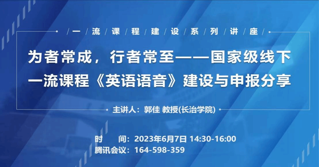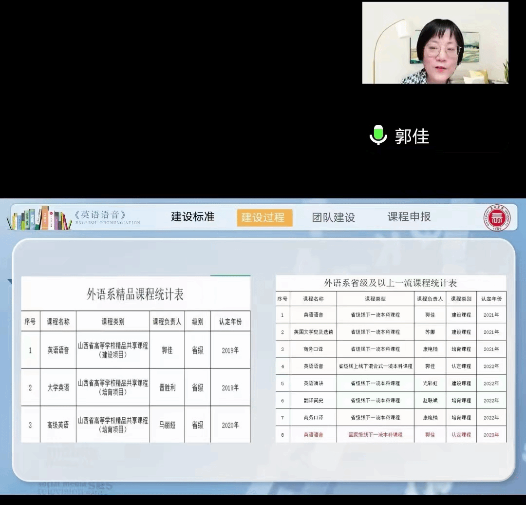 2023年6月7日下午我系郭佳教授应邀为西安交通大学外国语学院做了国家级一流课程建设与申报交流分享。郭佳教授以她负责的国家级一流课程《英语语音》为例,从课程建设标准、课程建设过程、课程团队建设、课程申报等四个方面进行了讲述。
