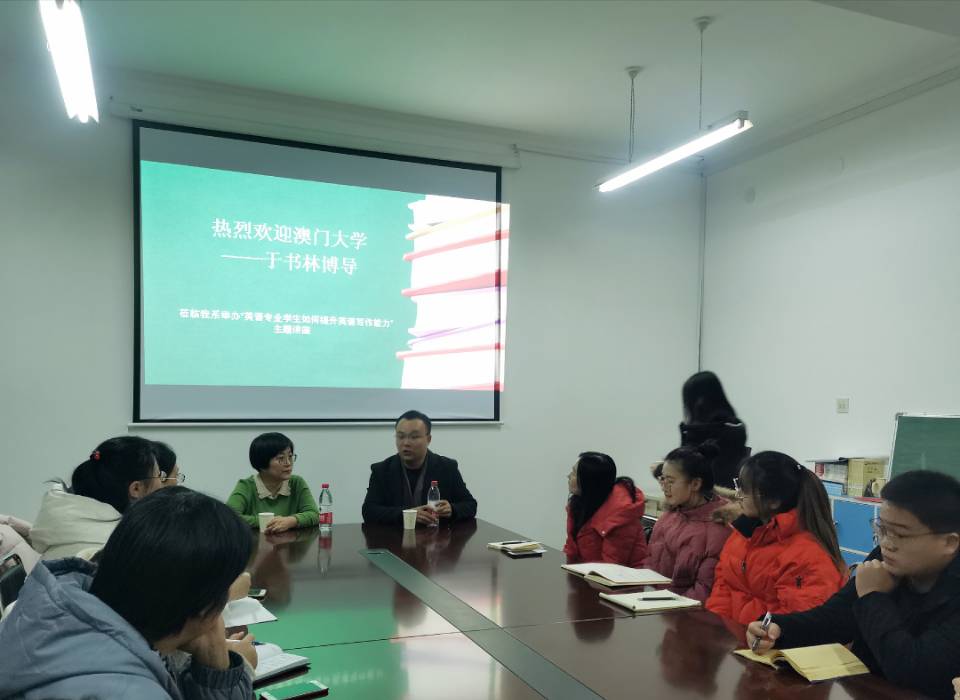 为提高我系教师的教学能力,拓宽我系学生的知识面,活跃学术气氛,我系特邀澳门大学博士生导师于书林老师于12月11日晚7:30在西办公楼三层会议室进行“英语专业学生如何提升英语写作能力”专题讲座。参加讲座的有我系部分教师及16-18级学生代表。本次讲座由我系主任郭佳老师主持。