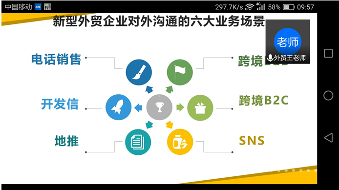 王老师认为如今的涉外企业对人才的需求既有量的不同,也有质的变化。在讲座中王老师围绕这六大场景(电话、开发信、地推、跨境B2B、跨境B2C、SNS)进行了阐述。 解释了新外贸企业作为目前外贸人才市场的招聘主力军,对外业务沟通在哪些是需要主动沟通,哪些是需要被动沟通,哪里用到B2B,哪里用到B2C。 王老师又分析了《商务英语写作》、《商务英语视听说》、《跨境电商》等课程都应该根据商务环境的变化进行升级。如广告撰写要从形象公关、旅游广告升级到企业的促销广告、品牌广告。