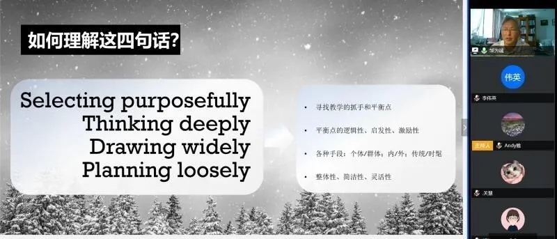 邹老师是华东师范大学教授,通过腾讯会议进行线上交流“外语课程设计”。课程设计的好坏直接影响到教学效果,所以,邹老师提出了“目标驱动”与“生本驱动”相结合的建议,合理运用教学设计的四条标准来解决二者之间的矛盾,即“selecting purposefully, thinking deeply, drawing widely and planning loosely。邹教授仔细分析这四条标准的内涵,深入浅出地运用教学实例阐述这些标准如何应用到实践教学中,简约又不简单。
