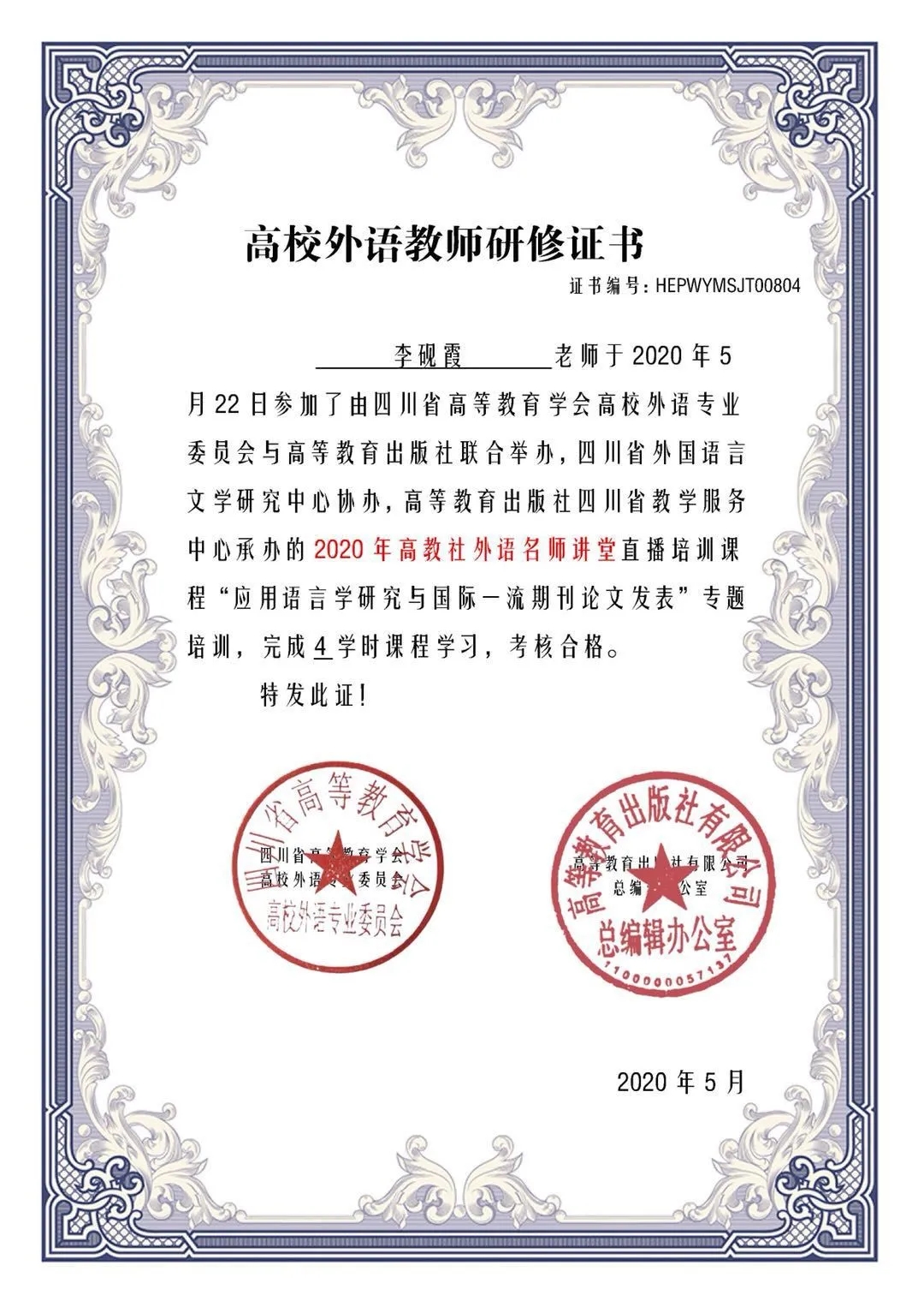 每位参加网上直播课的老师都获得在线研修课程结业证书。讲座结束后,翻译教研室又进行教研讨论,探讨讲座的收获。各位教师对于国际论文的选题及期刊选择有了进一步的了解。在日后阅读相关期刊时,也有了专业的侧重点。有利于在今后的教学研究过程中开辟新角度,创造新思路,同时可以将自己的新研究成果,新理念运用到今后的教学中,打造一个独具特色的外语课堂。