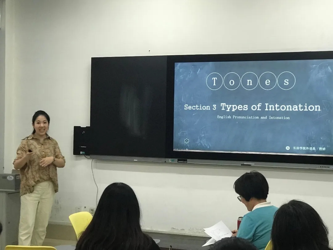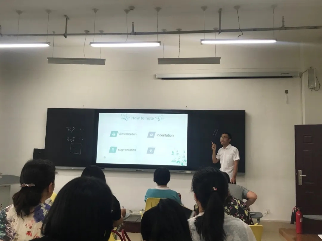 翻译教研室的王晶老师通过刚刚结束的十三届全国人大三次会议记者招待会的翻译导入,从口译笔记的特点、记录的内容、记录的语言、记录的格式、口译笔记装备等各方面讲解了口译笔记的基本知识,条理清晰,层次明了,语言流利,使大家对口译笔记有了更加深入的认识;语言学教研室的郭允雪老师讲课内容为英语连读规则,从学生自己的配音作品导入引出大部分学生存在的连读问题,然后使用学生喜爱的动画电影原声歌曲来介绍连读规则,能够引起他们的兴趣;商务英语教研室的程娇老师讲课内容为英语发音语调,课件制作精美,教师的教和学生的学有效结合,情感丰富,设计合理。