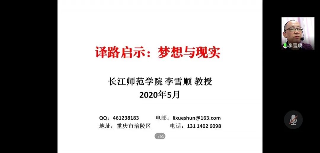 2020年6月9日下午三点,我系邀请长江师范学院李雪顺教授做题为:“译路启示:梦想与现实”讲座,讲座在企业微信平台进行,我系郭佳主任主持,200余名学生参加。