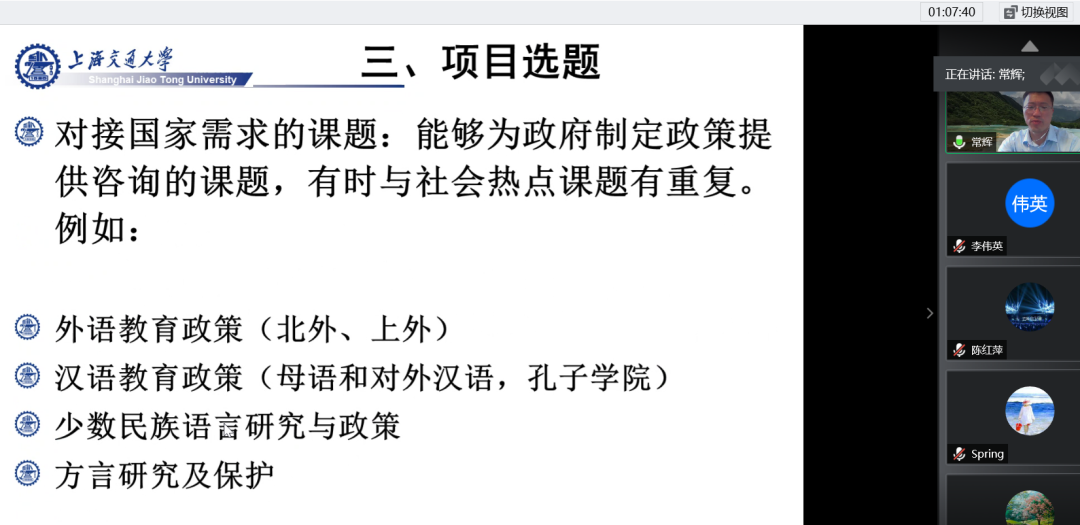 2020年6月23日下午,我系“2020年外语学术论坛”继续开讲,迎来了系列云端讲座之四——科研项目设计及申报。本场讲座由上海交通大学常辉教授主讲。常辉教授为上海交通大学外国语学院的博士生导师、常务副院长,在二语习得与加工、英语语言教学、英语语言水平测试、外语专业人才培养、外语学科建设等多个领域都颇有建树,个人学术成果非常丰富,是多项国家级、省部级基金项目的主持人。