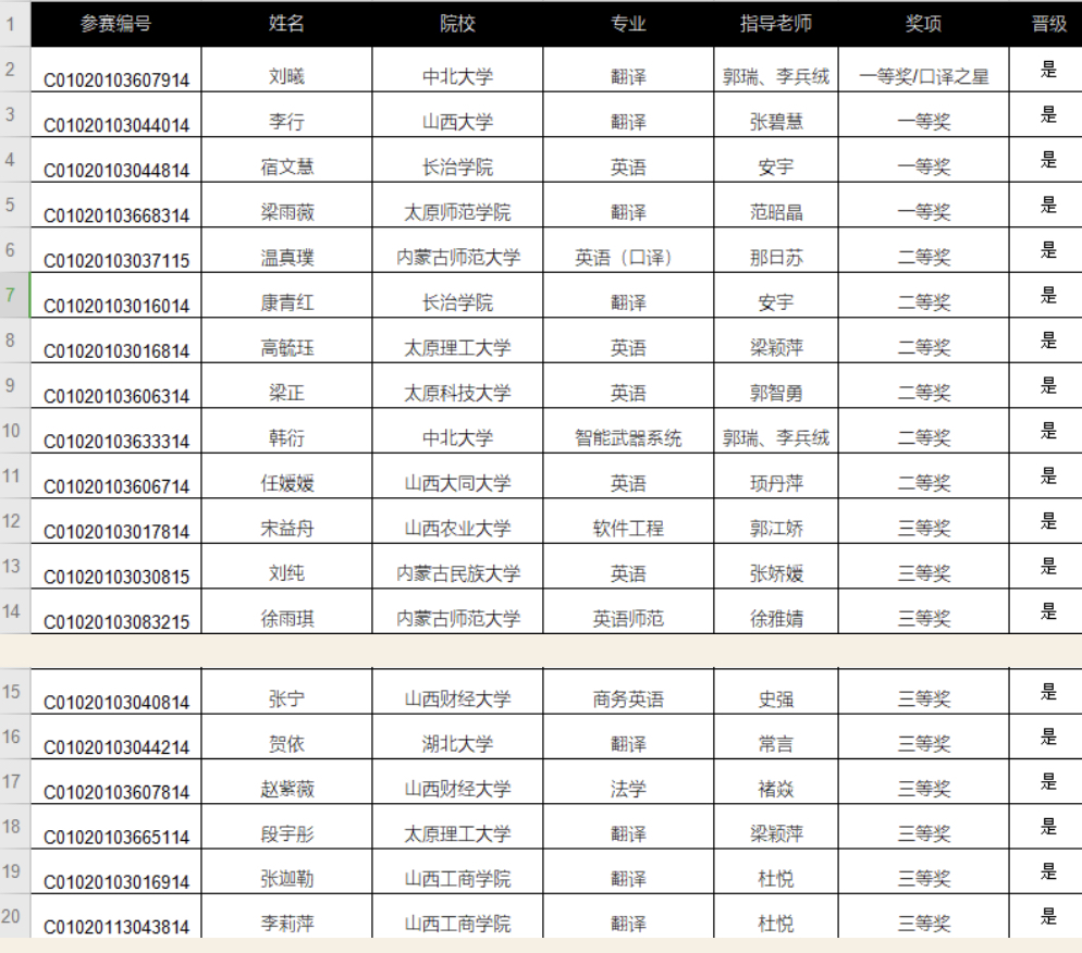 2020年7月8日,第九届全国口译大赛——山西-内蒙古赛区复赛结果新鲜出炉。初赛105名选手线上参赛,经过人工评审,共来自16所高校的56名选手顺利晋级省级复赛。其中,山西省50人,内蒙古自治区6人。复赛采取线上人工盲评模式,五位业内专业评委秉持公平、公正的原则在线打分。最终成绩排名如下: