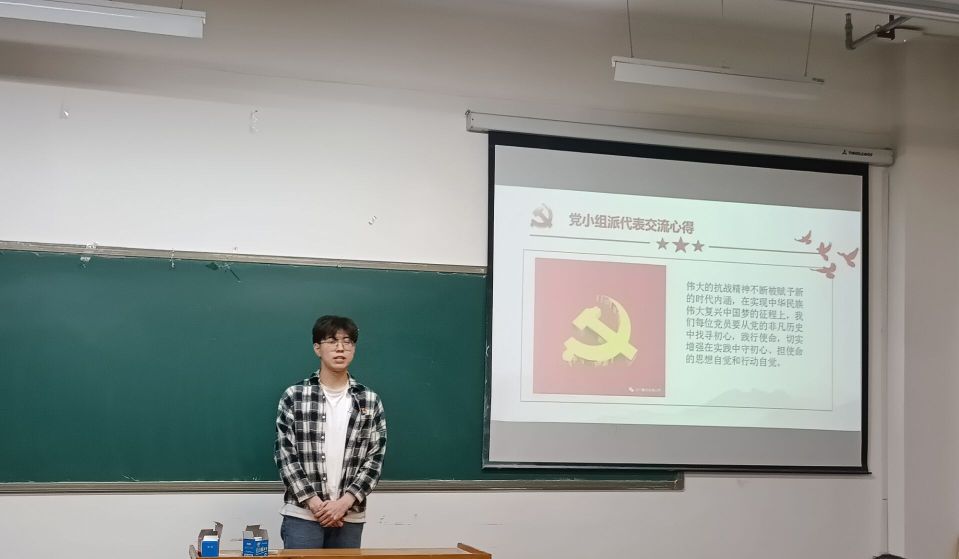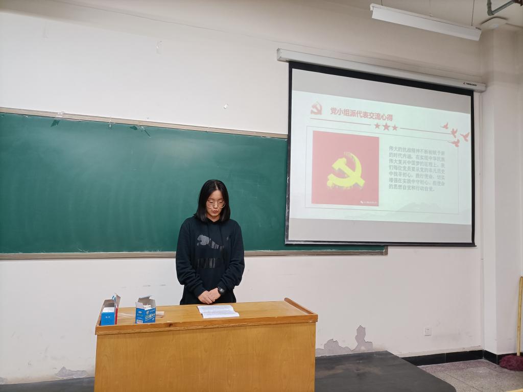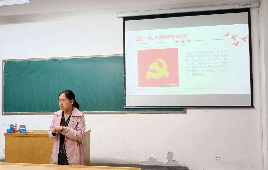 随后,刘洁同志带领我们从历史背景等方面回顾了抗日战争,共同学习了习近平总书记讲话精神,感知幸福生活的来之不易,由此联想到了最近的光盘行动,呼吁大家厉行勤俭节约、抑制铺张浪费。之后,各党小组派代表分享交流抗战心得,通过此环节,党员们加深了对伟大抗战精神内涵的理解,提升了自身党性修养和历史使命意识,坚定了理想信念和责任担当。