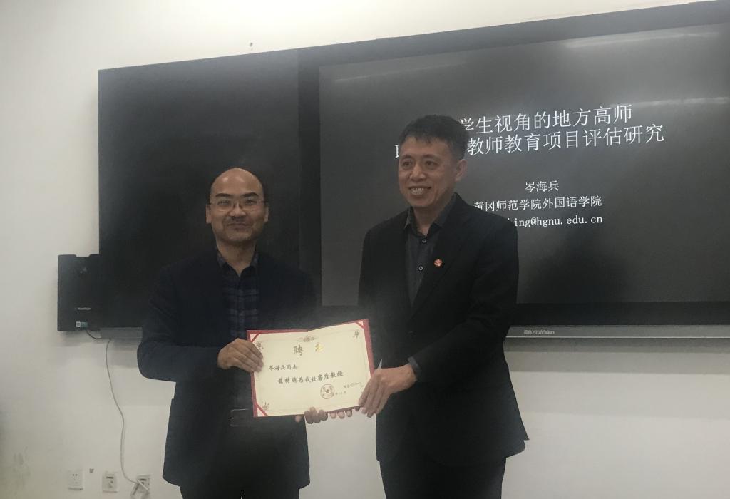2020年10月9日下午4:50,黄冈师范学院外国语学院院长岑海兵教授,应邀为我系教师做了题为《基于学生视角的地方高师职前英语教师教育项目评估研究》的报告。讲座由必威西汉姆联副主任李伟英主持,赵巨涛副院长首先代表学院向岑海兵教授颁发了客座教授聘书。