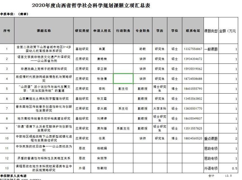 2020年11月6日,喜报再传。我系康艳楠老师《语言文学类非物质文化遗产外译研究—以山西省为例》、李正娜老师《非遗戏曲上党梆子的跨学科研究》分别获批2020年度山西省哲学社会科学规划课题一般课题项目,该两项课题充分体现了我系科研以地方文化为基础,为地方文化服务的定位。张朝阳老师《课程思政在地方本科院校英语类专业中的实施策略研究》获批山西省哲学社会科学规划课题外语专项课题,该课题也是我系推动外语课程思政建设的大胆尝试,进一步将课程思政改革与教学研究深度融合,使外语类课程和思想政治理论课同心同向,在立德树人方面发挥积极作用。