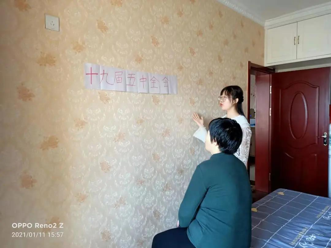 杜京颖、梁朝霞是英语2001班的学生,寒假期间,她俩自觉组队,一个负责记录,一个负责行动,在较短时间内进行了社会实践,有效完成了寒假“五个一”作业。开展十九届五中全会精神宣讲时,梁朝霞以家庭为阵地,以父母为对象,以深入浅出的方式为父母讲述了十九届五中全会中与他们的生活息息相关的内容。开展节约粮食宣传时,两位同学深入挖掘各种素材,充分发挥自媒体优势,制作了宣传短视频“浪费可耻,节约为荣”。