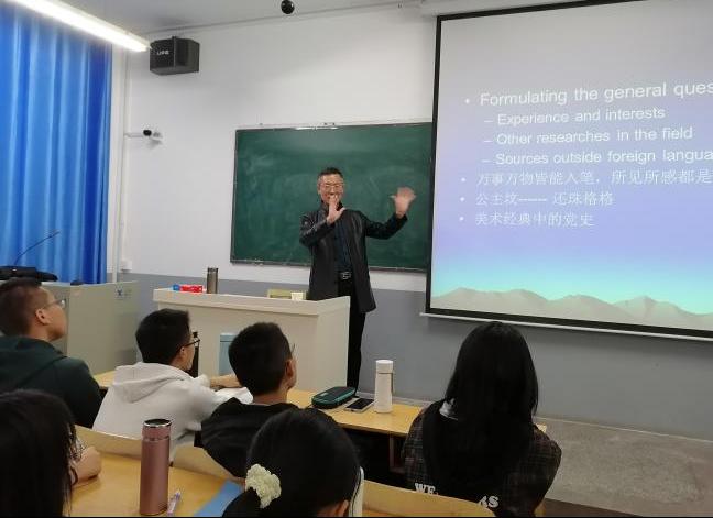 田教授从研究问题的提出、研究方法、统计手段、论文写作等方面介绍了英语专业学生研究能力的培养途径。他旁征博引,采用生活案例、语言案例、语言学习案例、历史案例,用风趣幽默的语言把抽象的概念具象化,同学们听得津津有味。