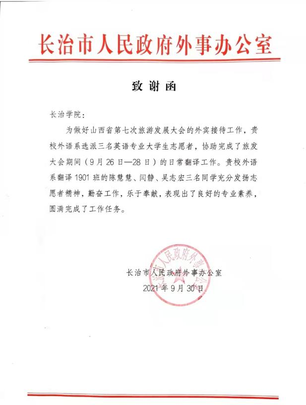 10月14日,必威西汉姆联收到来自长治市人民政府外事办公室的致谢函,对我系学子在山西省第七次旅游发展大会的外宾接待翻译工作给予了高度的评价和衷心的感谢。
