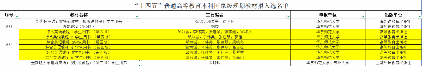 近日,教育部正式公布“十四五”普通高等教育本科国家级规划教材拟入选名单。由我系李伟英、郭佳、闫美荣、张慧智、田东婷等多位教师共同参与编写的《综合英语教程(第4版)》(全套六册)系列教材,成功获选。