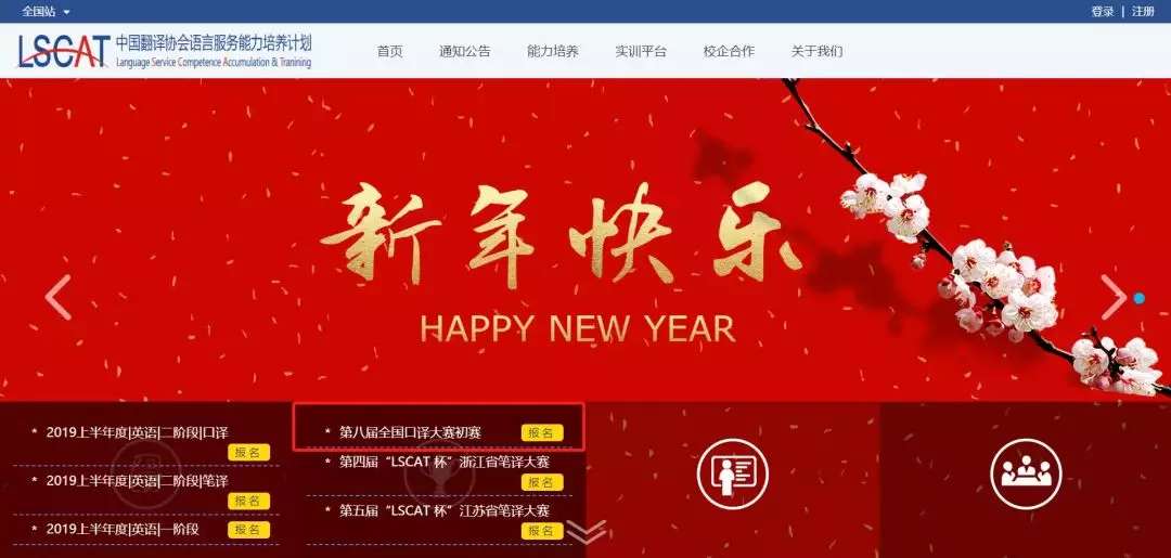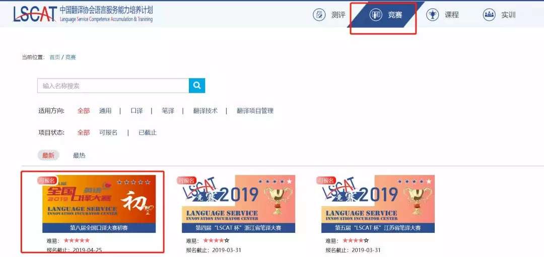 四、登陆成功后,点击右上角的“竞赛”,下方会出现赛事活动,第一个就是“第八届全国口译大赛”;