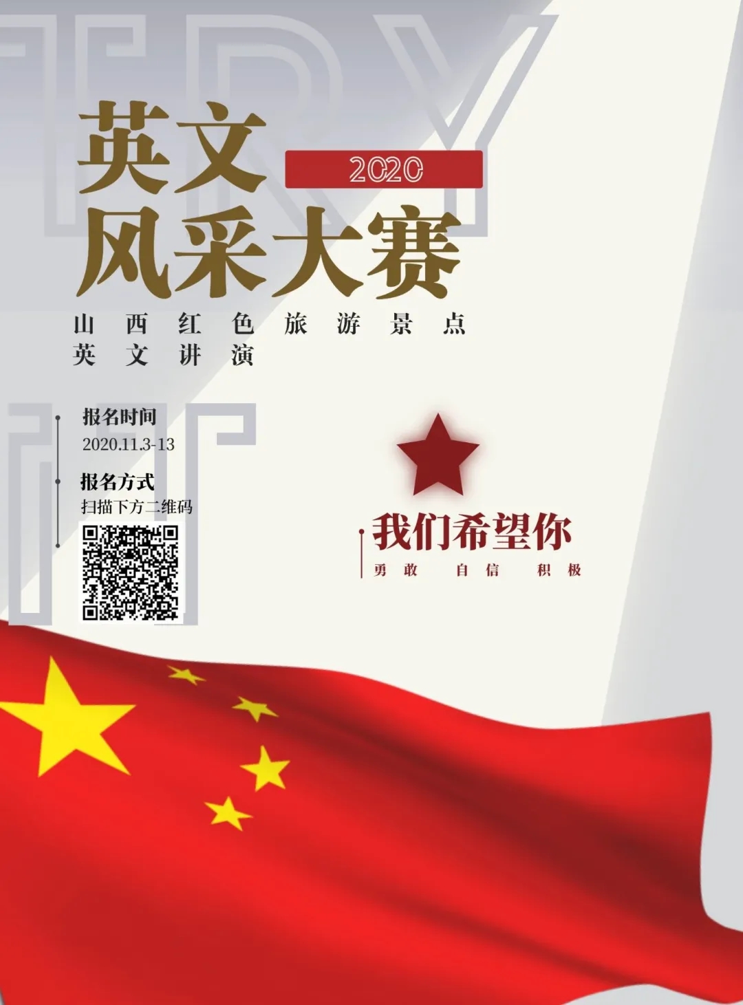 红色精神是中华民族精神的重要组成部分,弘扬红色文化,了解学习红色革命精神是每一位青年大学生的必修课。为了深入贯彻落实习近平总书记关于“思政进课堂”理念,传播先进文化、提高学生的思想道德素质,让爱国主义深入人心,同时进一步丰富我院大学生的第二课堂活动,激发学习者的演讲兴趣,夯实学生的语言基础,营造良好的学习氛围。由院团委和必威西汉姆联联合主办的“betway西汉姆联大学生英文风采大赛——山西红色旅游景点英文讲演大赛”将在十一月份开展。