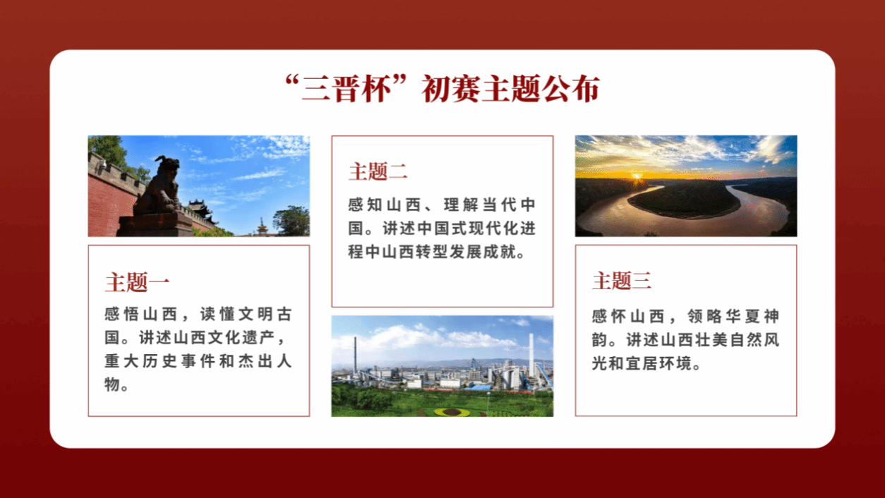 本次大赛主题内容围绕“讲好山西故事”,涵盖山西省自然和文化遗产、古今人物,新时代经济社会发展成就等内容。