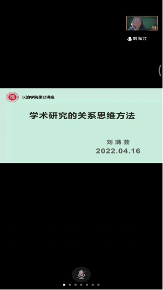 刘满芸教授在线上分享了主题为“学术研究的关系思维方法”的报告。刘老师主要就关系思维的界定及其哲学依据、同质关系的构建以及关系思维的方法与路径做了深入介绍,并指出关系思维是一种“立体交叉”,相互建联的思维模式,在今后的学术研究中,我们要尝试关系建构、重视学术逻辑自洽、突破学术界域,大胆尝试学术创新。