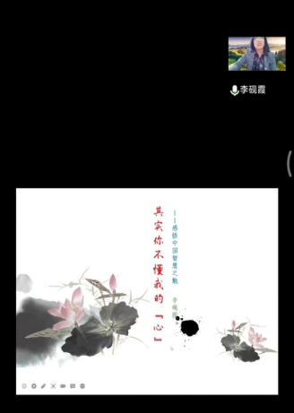 李砚霞副教授在线上做了“其实你不懂我的‘心’——感悟中国智慧之魅”的报告。报告从中国传统文化中蕴藏的哲学智慧,讲到传统哲学的现代诠释,指出构建“人类命运共同体”是对中国传统文化与智慧的继承和发扬。