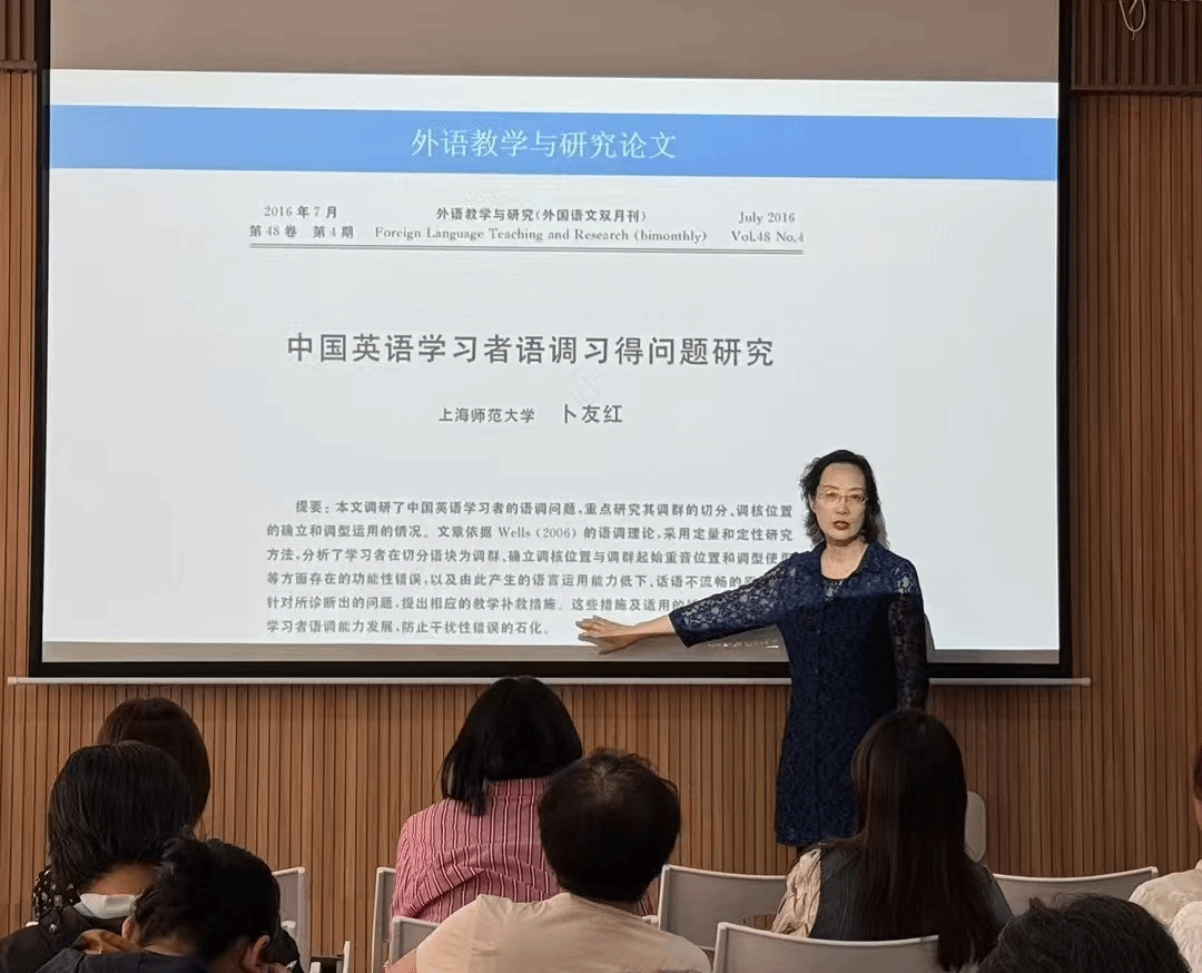 此外,卜老师还分享了她从教学走向科研的思考路径,她是如何在设计语音教学内容和备课过程中如何不断发现问题、积累素材、提炼研究视角的。她还指出,教学实践中隐藏着丰富的研究价值,学生就是科研的宝藏。教师只要有心,就能从学生的语音表现、学习反馈乃至课堂互动中发现问题、提出问题,并在不断优化教学的过程中孕育出高质量的研究课题。她鼓励在场教师善于观察、勤于反思,把“教”与“研”融合起来,在教学中发现灵感,在研究中提升实践。