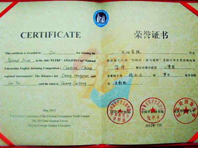 2012年华中地区辩论赛_证书