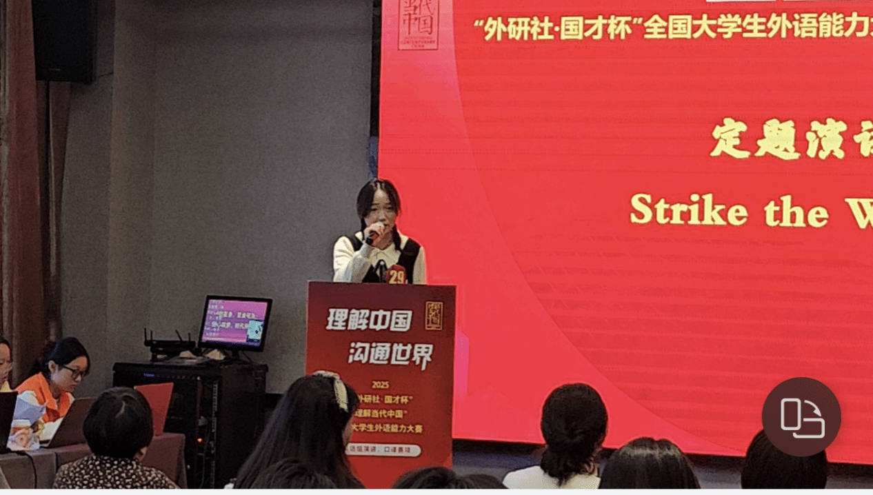 大赛中,我系学子以青春 “小我” 筑就强国 “大我”,用青春之声传递时代先声。这既展现了外语教学思政育人与 “理解当代中国” 融合的优异成果,也有力印证了我系长期以来对学生国际传播能力培养的高度重视。