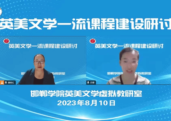 我系教师苏娜应邀在邯郸学院英美文学虚拟教研室做主题为“英美文学一流课程建设”的研讨发言。本次研讨会于2023年8月10举办,来自全国8省9所高校的17名教师通过视频会议,云端分享研讨,共同探讨学习。