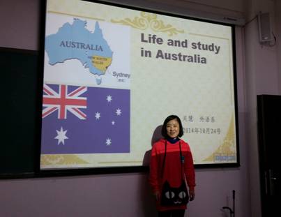 根据本学期必威西汉姆联的安排,语言学教研室推荐关慧老师在系学术交流活动期间做题为Life and Study in Australia的报告。关慧老师于2014年10月24日在一号教学楼505教室就澳大利亚的福利、环境、节日、教育体制、课程设置等方面进行了生动详细的讲述,并利用视频、图表、音乐等方式展现了澳大利亚的方方面面,使我们拓展了视野,体验了不同的文化。