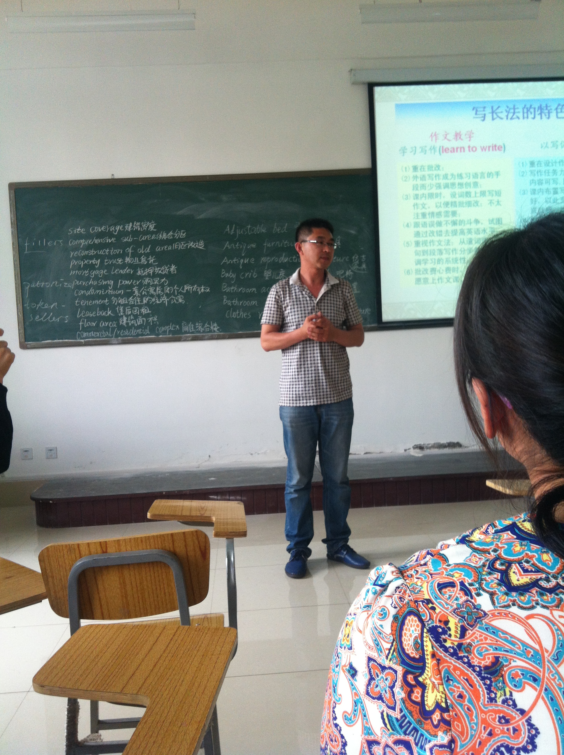 2014年6月5日下午5时我系全体教师在1号教学楼505教室举行学术交流,本次主讲教师为大学外语教研室张朝阳老师,主题为"写长法下的语块嵌入研究”,张老师首先介绍了英语写长法,接着讲述了英语语块的分类,最后讲解了语块如何嵌入在写长法中。 讲座激发了所有教师的热烈讨论,大家一致认为此次讲座对解决大学英语教学中存在的实际问题有很强的指导意义,对教师教英语和学生学英语有极大的促进作用。