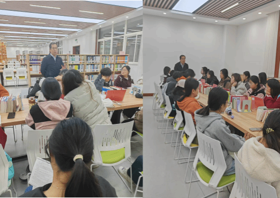 张雅老师是英语专业24级新生的学业指导老师。他带领学生与图书馆老师们进行了座谈交流,浏览了专业书籍,还为学生讲解了课程设置,与学生共同讨论了阅读的方式和好处。