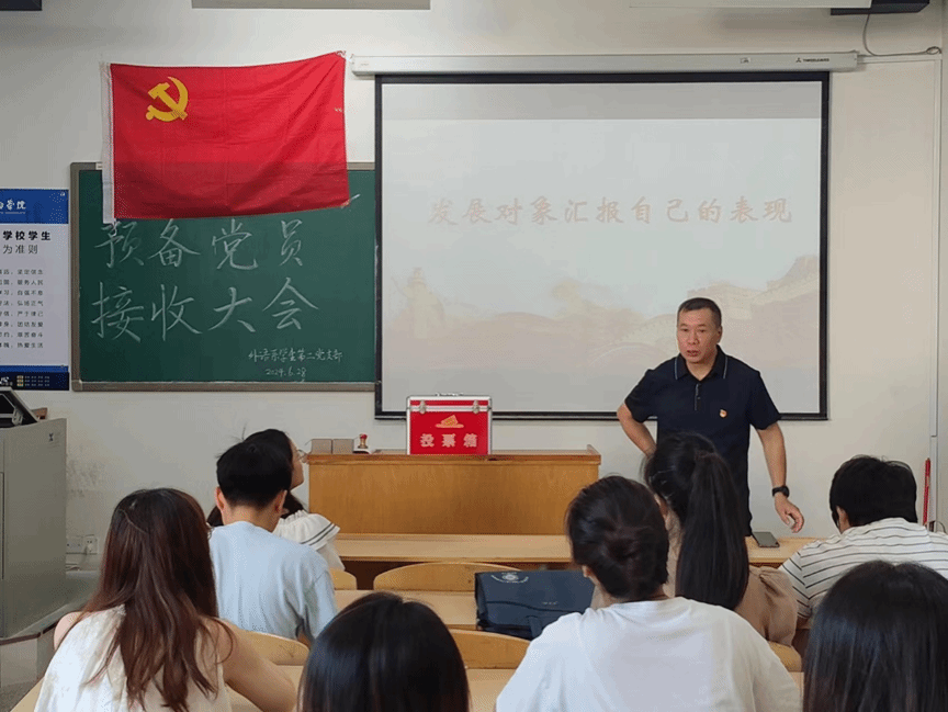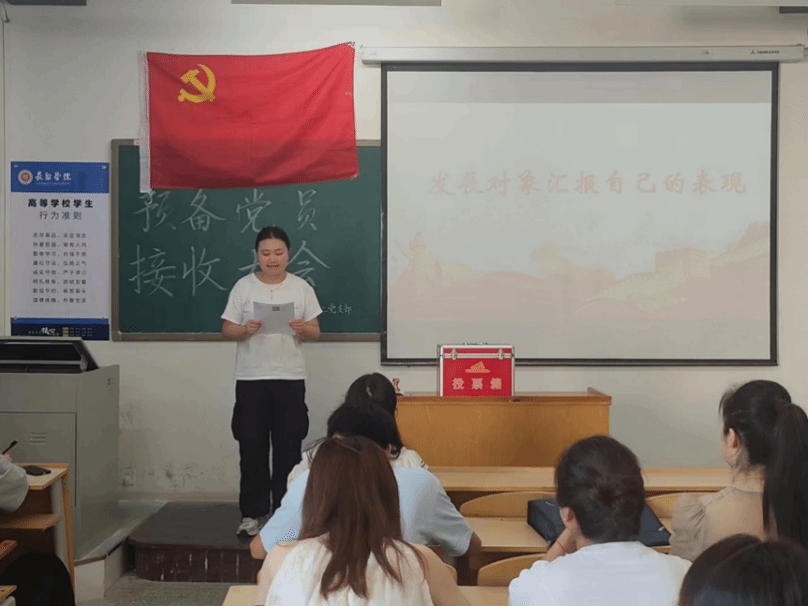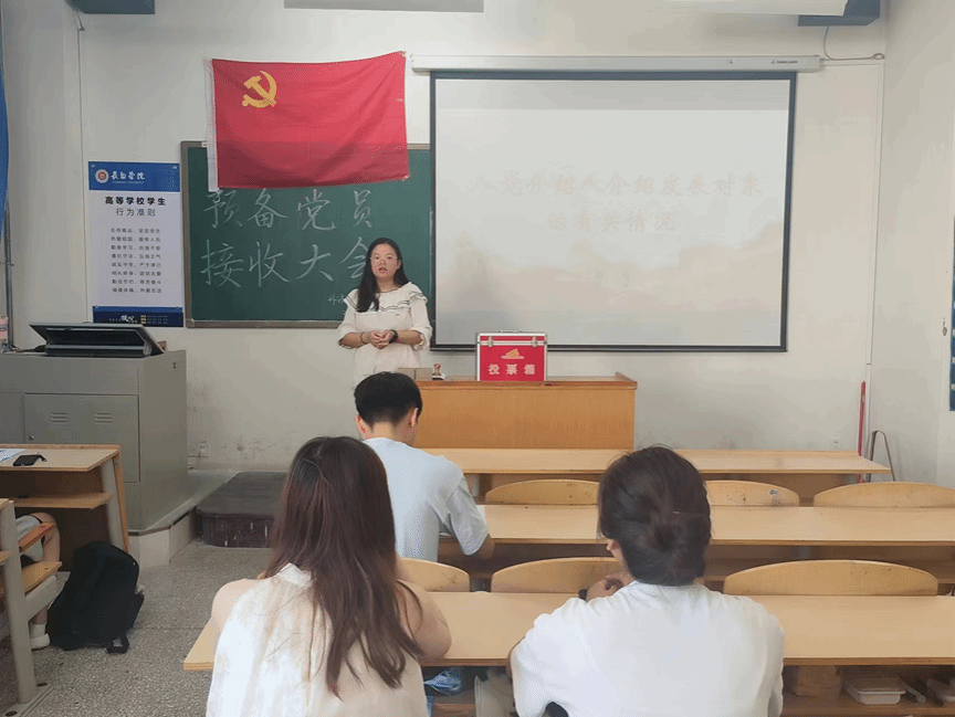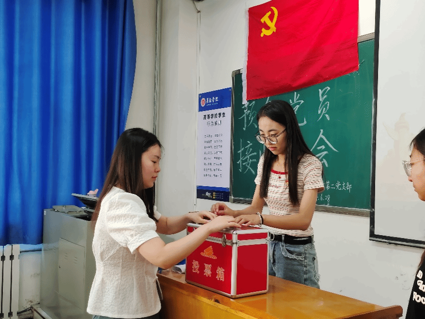 会议第五项,本次预备党员接收大会采取无记名投票的方式进行表决。最后由董宁宁同志宣读支委会决议,经全体与会党员认真讨论并投票表决,一致同意刘津津等14位同志成为中共预备党员,并为其颁发党徽。