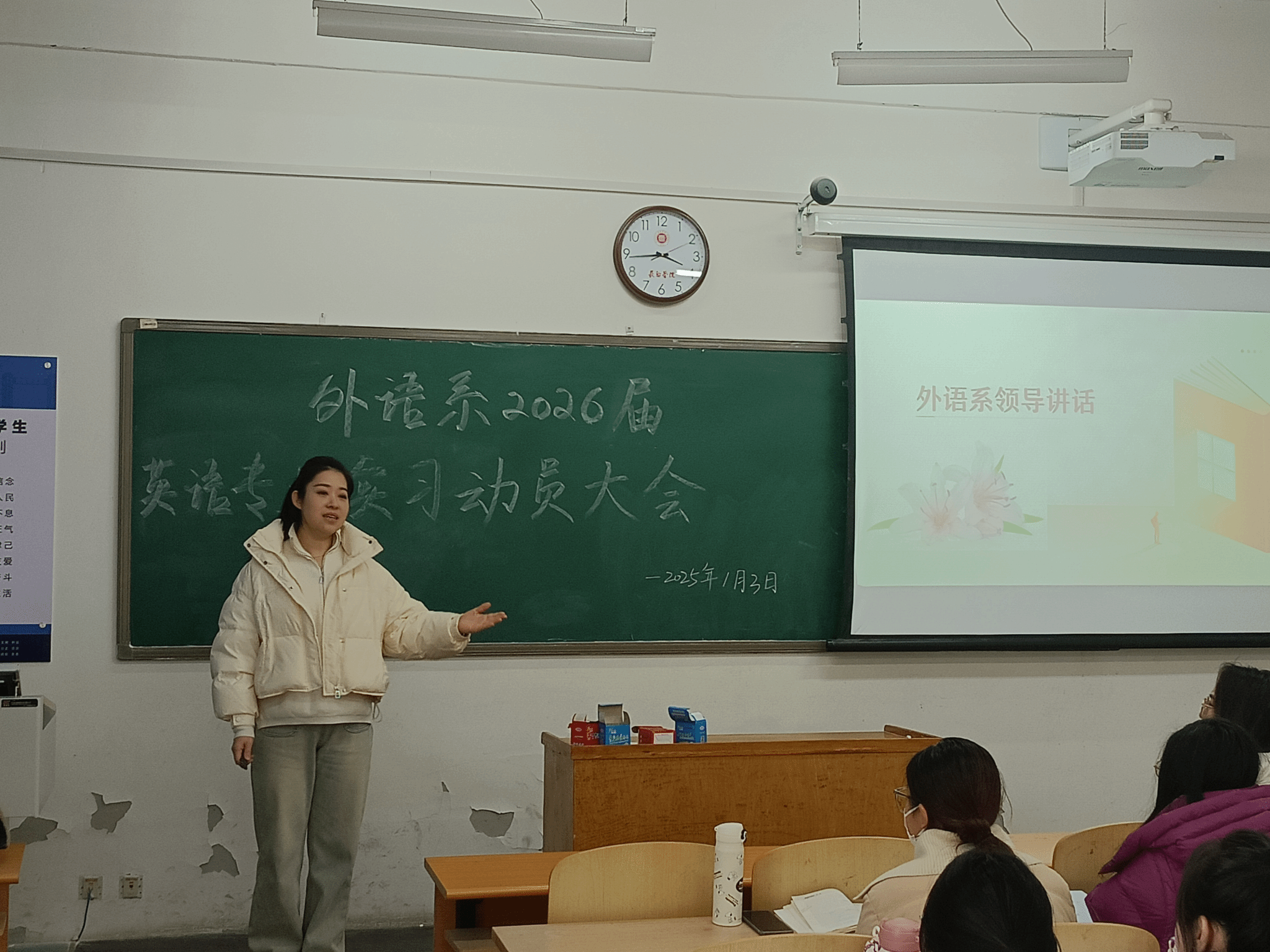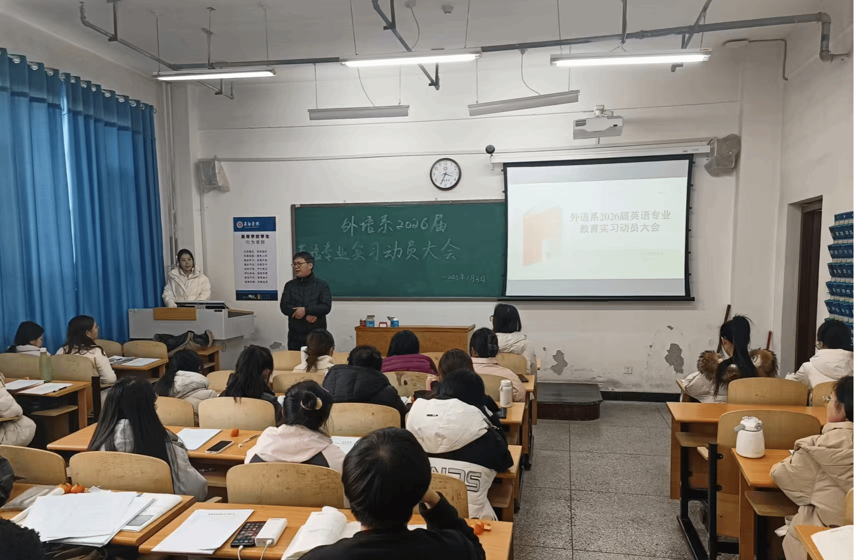 教育实习是英语专业人才培养的重要组成部分,是师范生走向工作岗位、投身于教育事业的必经之路,也是师范生学习教育实践技能和积累经验的宝贵机会,为帮助我系英语专业学生明确实习任务与要求,做好实习前的各项准备,进一步锻炼的实践能力,我系于2025年1月3日召开2026届英语专业教育实习动员大会。本次大会由必威西汉姆联副主任程娇老师主持,必威西汉姆联党委副书记张毅老师、英语2201班辅导员郜梦茜老师以及2026届英语专业全体学生参加。