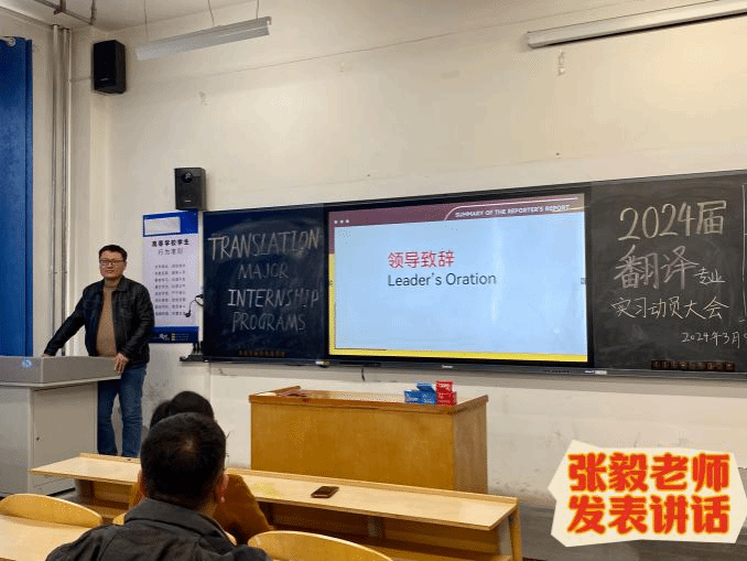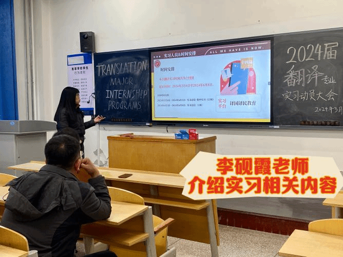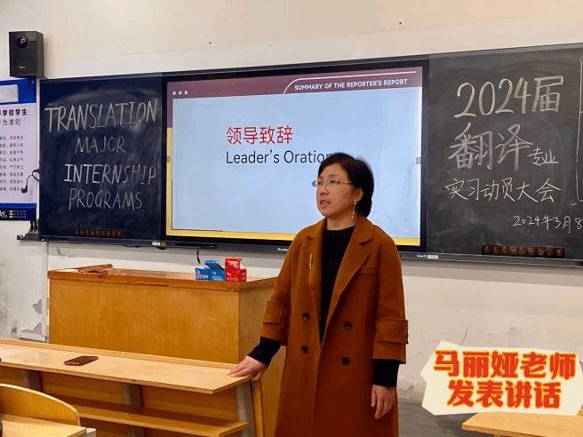 毕业实习是翻译专业的重要教学环节,也是实现专业人才培养目标的重要环节,是在校翻译知识学习和实际操作技能锻炼的继续、深化、补充和效果检验过程。为保证我系翻译实习工作规范、有序地开展我系于3月8日下午在1号楼102教室召开2024届翻译专业毕业生实习动员大会。本次大会由翻译专业负责人李砚霞老师主持党委副书记张毅老师,教学副主任马丽娅老师,实习指导组刘满芸老师、赵联斌老师、秦龙蛟老师以及 2024 翻译专业毕业生参加。