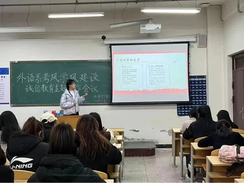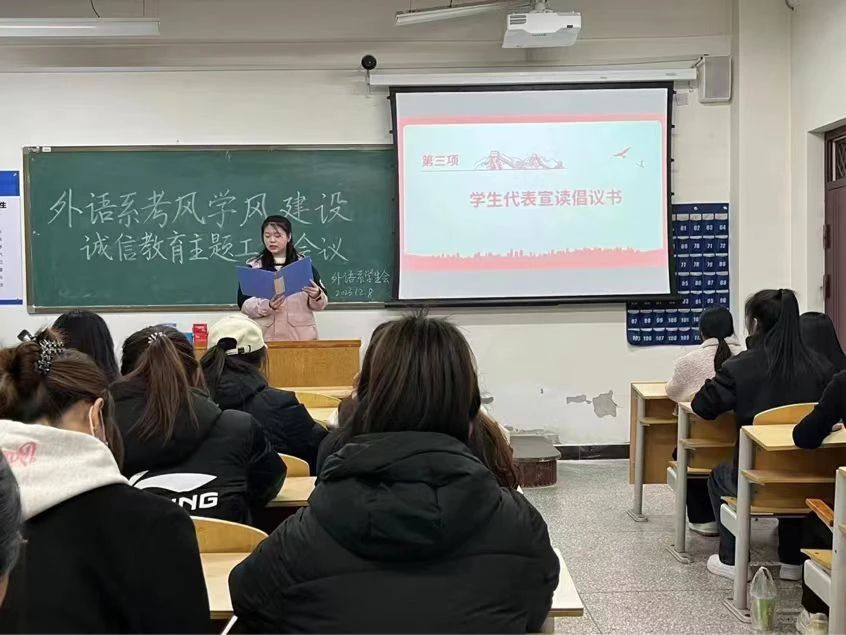 会议第三项,学生代表宣读倡议书。告诉大家一定要守诚信,遵守考试纪律,坚决不作弊。诚实守信是中华民族的美好品德,不仅要在考试中做到诚实守信不作弊,同时在生活学习的各方面都要做一个诚实守信的大学生。