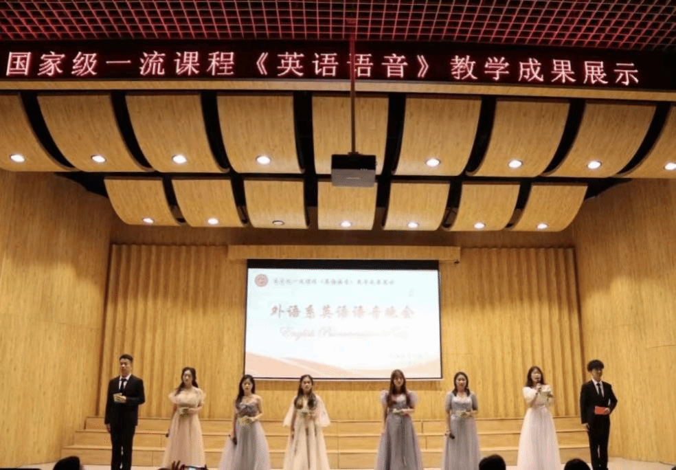 晚会伊始,郭佳教授介绍了我系英语语音教师团队,这是一支梯队合理的优秀教学团队,在课程负责人郭佳教授的带领下,经过教学团队的不懈努力,历经5年的时间,《英语语音》课程在2022年获评山西省一流“认定”课程,其后,又在2023年入选国家级一流课程。同时,郭佳教授肯定了同学们一年以来积极参加语音训练的付出和努力,并对同学们在晚会中的精彩表现表示期待。