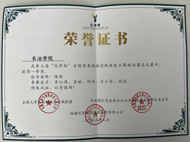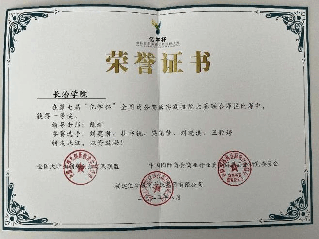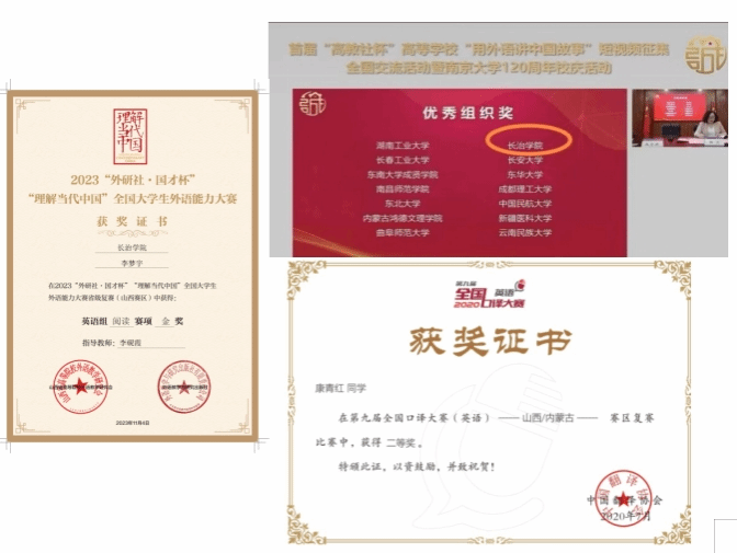 我系十分重视学生实践能力培养。近三年学生获得省级以上奖项共183项,频繁斩获国家级、省级一等奖。代表赛事有:“外研社·国才杯”“理解当代中国”全国大学生外语能力大赛、“外研社·国才杯”英语辩论赛、“外教社杯”全国高校学生跨文化能力大赛、全国口译大赛、全国商务英语实践大赛、山西省高校师范生教学技能竞赛、配音比赛等。